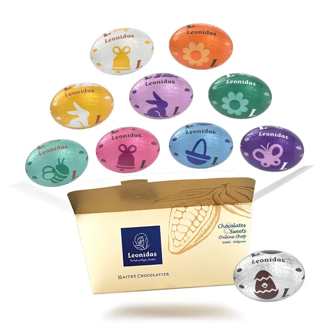 For Easter we offer the Leonidas wrapped mini Easter Egg assortment. The assortment includes a colorful combination of solid and filled eggs, in milk, dark and white chocolate.