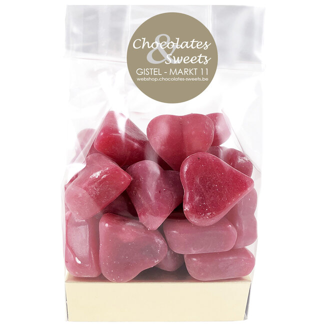 Ingrédients: sucre, gélifiant (gomme arabique), sirop de glucose, eau, gélatine, arôme de framboise, colorants E120.